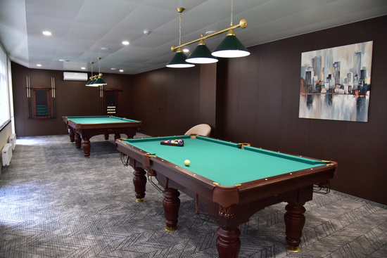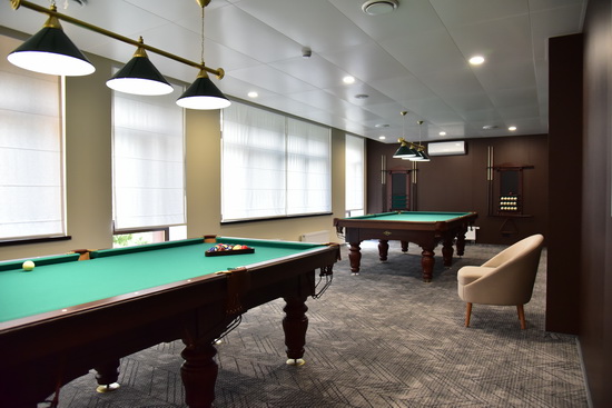Бильярдный зал для всех желающих, в том числе детей в возрасте до 14 лет, но только в сопровождении взрослых. Игровое оборудование (шары, кий, мел и др.) выдаются у администратора, затем возвращаются обратно. Посетителям бильярдного зала необходимо иметь с собой сменную обувь.